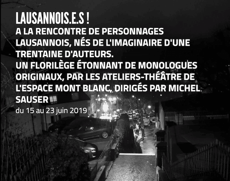 Au début de l’été 2018, l’( espace mont blanc ) a proposé à une trentaine d’auteur·e·s lausannois·e·s d’écrire, pour les participant·e·s de ses ateliers-théâtre, de courts monologues présentant la vie fictive, supposée, transposée ou inspirée de personnages dont le cadre de vie serait la ville de Lausanne.